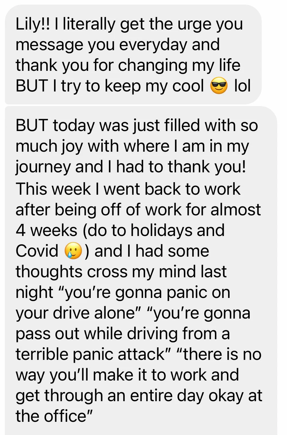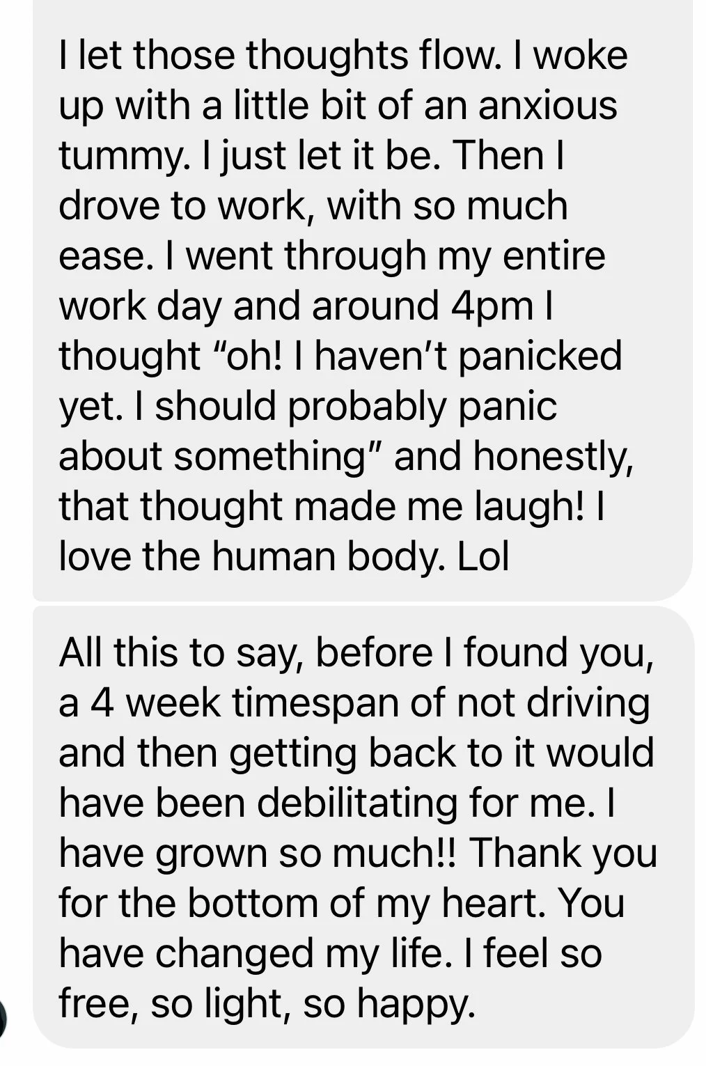 This amazing woman experienced anxiety and panic for 7 years and struggled with driving anxiety and now feels like herself again! She drives with ease and isn’t bothered by anxious thoughts if they pop up because she knows they’re just thought (not truth) and she doesn’t have to take her thoughts seriously. When we don’t take our thoughts seriously they flow effortlessly and without impact.